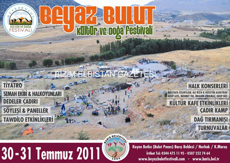 Elbistan’a 30 kilometre uzaklıktaki Nurhak’a bağlı Barış Beldesi’nde 30-31 Temmuz 2011 tarihlerinde Beyaz Bulut Kültür ve Doğa Festivali’ni düzenlenecek. Barış Belediye Başkanı Hüseyin Doğan, gazetemize yaptığı açıklamasında hazırlıkların tamamlandığını söyledi.