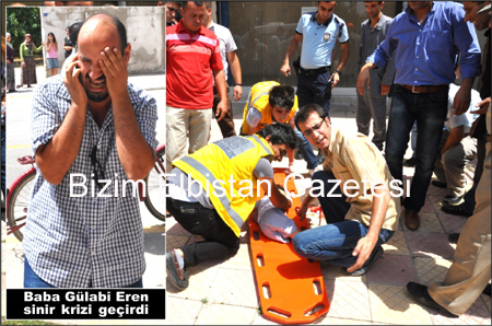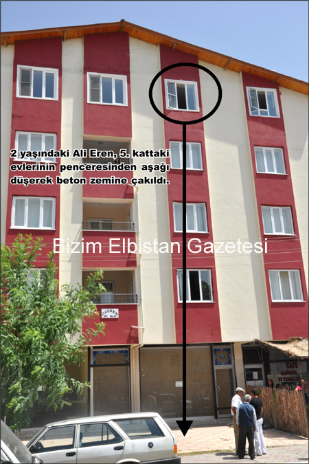Alınan bilgilere göre olay dün saat 13.30 sıralarında Göktürk Caddesi’nde meydana geldi. İddialara göre Gülabi-Canan Eren çiftinin 2 çocuğundan biri olan 2 yaşındaki Ali Eren, apartmanın 5. katındaki evlerinde oynarken henüz bilinmeyen bir nedenden dolayı pencereden aşağıya düştü. Apartmanın önündeki beton zemine çakılan Ali Eren için çevredeki vatandaşlar 112 Acil Servis’i arayarak ambulans çağırdı. Ali’yi kanlar içerisinde yerde yatarken gören Gülabi-Canan Eren çifti olay yerinde sinir krizleri geçirirken, Ali Eren ambulansla Elbistan Devlet Hastanesi’ne kaldırıldı. Ali Eren’in yapılan ilk müdahalesinde çenesinde kırıklar tespit edilirken, iç kanamasının da bulunduğu öğrenildi. Ali Eren’in düştüğünü duyan yakınları ise hastaneye akın etti. Acil serviste doktorlardan sevindirici haber bekleyen Gülabi-Canan Eren çiftinin ağıtları yürekleri dağlarken, Ali Eren’in hayati tehlikesi olduğu için ambulansla Kahramanmaraş Tıp Fakültesi’ne sevk edildi.