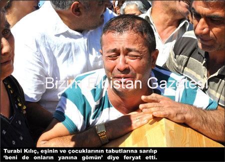 Güçlükle ayakta durabilen Turabi Kılıç, eşinin ve çocuklarının tabutuna sarılıp ‘yalvarırım beni de onların yanına gömün’ diye ağıt yakması cenazeye katılanların yüreklerini dağladı. Acıya daha fazla dayanamayan Turabi Kılıç, eşi ve çocuklarının tabutu önünde baygınlık geçirdi.