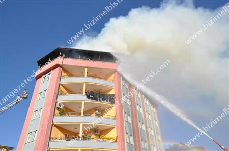Apartman sakinlerinin korku dolu dakikalar yaşadığı yangın, uzun süren çalışmalar sonunda söndürülürken, yangın sonunda çatının büyük bir bölümü yandı.
