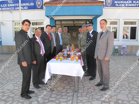 Türk Polis Teşkilatı’nın Kuruluşunun 167. Yıldönümü’nü çeşitli etkinliklerle kutlayan Nurhak İlçe Emniyet Amirliği, düzenlediği kokteylde başarılı personellerini başarı belgesi ile ödüllendirdi. Nurhak kaymakamı Eyüp Fırat ile kurum amirlerinin de iştirak ettiği kutlamalar sırasında bir pasta kesildi. Üzerinde polis ambleminin yer aldığı devasa pasta, Nurhak kaymakamı Eyüp Fırat ve Nurhak İlçe Emniyet Amiri Hasan Alpaslan Altuğ tarafından kesildikten sonra davetlilere ikram edildi. 4-10 Nisan Polis Haftası’nın Nurhak’ta çok güzel kutlandığını belirten Nurhak İlçe Emniyet Amiri Hasan Alpaslan Altuğ; “Emniyet teşkilatımızın kuruluşunun 167. yıldönümü kutlama programına teşrif ederek bizleri yalnız bırakmayan başta İlçe Kaymakamımız Sayın Eyüp Fırat olmak üzere tüm kamu kurum çalışanlarına ve vatandaşlarımıza teşekkür eder şükranlarımızı sunarız” dedi.