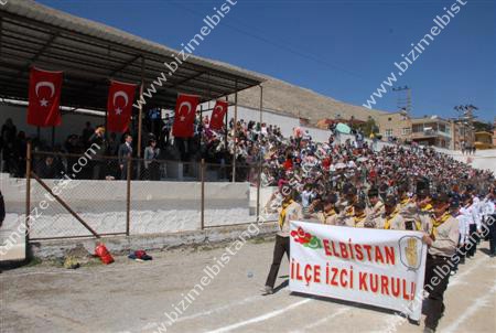 Çelenk sunma töreninin ardından kutlamaların yapılacağı Oruçoğlu Stadyumu’na geçildi. Elbistan Kaymakamı Metin Maytalman, Garnizon Komutanı Binbaşı İsmet Korkut, ve Elbistan Belediye Başkan Vekili Fidan Aksu, stadyumu dolduran öğrenciler ve halkın bayramını kutlaması ile başlayan törende, daha sonra saygı duruşunda bulunularak İstiklal Marşı okundu.