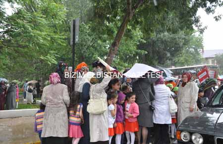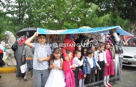 Yürüyüş öncesi birden bastıran sağanak yağış nedeniyle meydanda toplanan öğrenciler zor anlar yaşarken, öğretmenler ve veliler, yağmurdan korumak için öğrencilerin bir kısmını otobüslere bindirirken, bir kısmını da Elbistan Belediyesi ile Polisevi’ne götürdü. Bazıları ise üzerlerine çektikleri okulların pankartları ile kendilerini yapmurdan korumaya çalıştı.