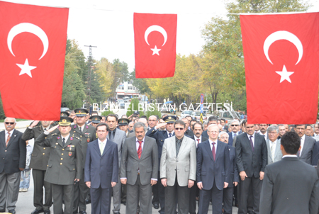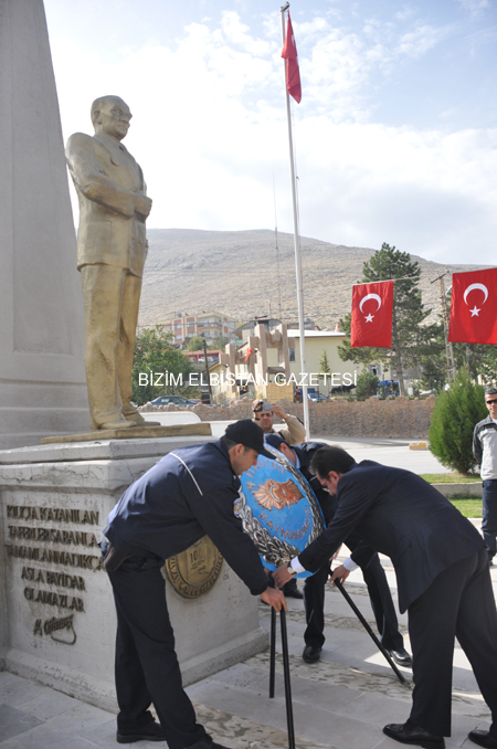 Elbistan Kaymakamı Metin Maytalman, Garnizon komutanı Kurmay Binbaşı Süleyman Bilir, Elbistan Belediye Başkanı Avukat Durmuş Küçük, Cumhuriyet Başsavcısı Özden Doğan, Adli Yargı ve Adalet Komisyonu Başkanı Attila Oğuz, Elbistan Meslek Yüksek Okulu Müdürü Haydar İnce, Askerlik Şubesi Başkanı Üsteğmen Mesut Çoban, İlçe Emniyet Müdürü Mehmet Adalı, kurum amirleri, bankalar, siyasi parti, ve sivil toplum örgütü temsilcileri, öğretmen ve öğrencilerin katılımıyla gerçekleşen törende kurumlar tarafından Atatürk Anıtı’na çelenk sunuldu.