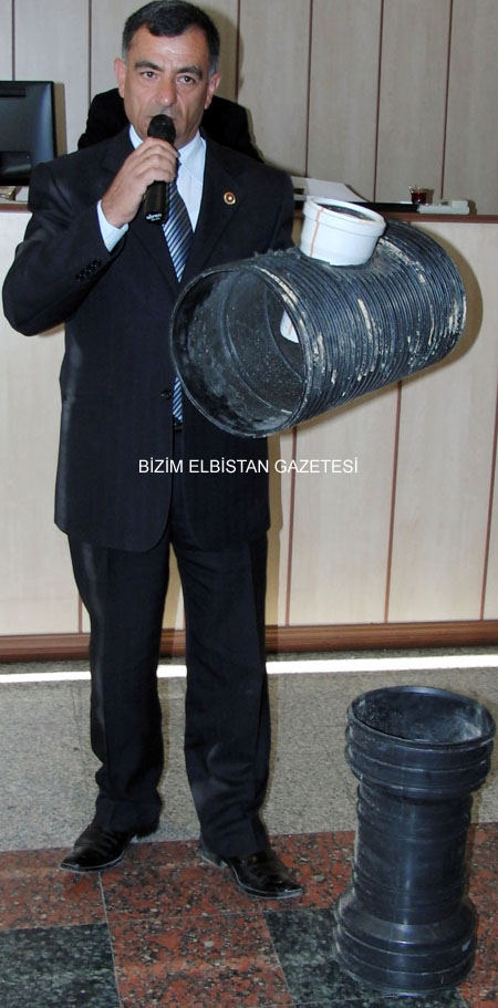 1 Kasım 2010 Pazartesi günü toplanan Kahramanmaraş İl Genel Meclisi’ne AK Partili İl Genel Meclisi Üyesi Ali Demir elinde kanalizasyon inşaatlarında kullanılan 2 farklı C boru ile geldi. Bir eline boru bir eline mikrofonu alan Ali Demir, elinde C borusunun kanalizasyon inşaatlarında kullanılan boru olduğu belirterek; “Şu anda Kahramanmaraş ve ilçelerinde yapılan kanalizasyon inşaatlarının bir kısmında doğru C borusu kullanılmakta, bir kısım inşaatlarda ise yanlış C boruları kullanılmaktadır. Benim üzerinde durduğum husus şudur: ekleme şeklinde bir yapıştırıcı kullanılarak elde edilen C boruları, gelecekte köylerimizin kanalizasyon sistemini çalıştırmama riski taşımaktadır. Bu boruların yerine tek parça halinde üretilen boruların kullanılması gerekmektedir. Elbistan’ın 4 köyünde inşaatı devam eden kanalizasyon işinin ihalesi İl Özel İdaresi Su ve Kanal Müdürlüğü’nce yapıldı. Teknik takibinden de bu birim sorumludur. Bizler seçilmiş il genel meclis üyeleri olarak, gördüğümüz yanlışları İdare’ye aktarmak ile yükümlüyüz. Bundan sonrası İl Özel İdaresi Genel Sekreterliği sorumluluğundadır. Köylerimizde kanalizasyon sistemlerinde C borularından kaynaklanan bir aksilik yaşanmaması için, İl Özel İdaresi Genel Sekterlik makamının en olumlu tedbirleri alacağına olan inancım tamdır” dedi. Demir’den sonra söz alan AK Parti’nin diğer Elbistanlı İl Genel Meclisi Üyeleri Ahmet Göçer, Sırrı Demir ve Hüseyin Tanrıverdi de Ali Demir’i destekledi.